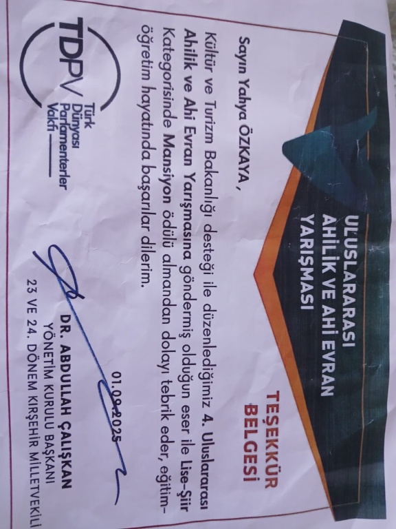 Kültür Bakanlığı'nın desteğiyle düzenlenen Ahilik ve Ahi Evran Yarışmasına lise şiir kategorisinde katılan öğrencimiz Yahya ÖZKAYA eseriyle ilk on eser arasına girerek mansiyon ödülü aldı.Değerli öğrencimizi tebrik eder başarılarının devamını dileriz